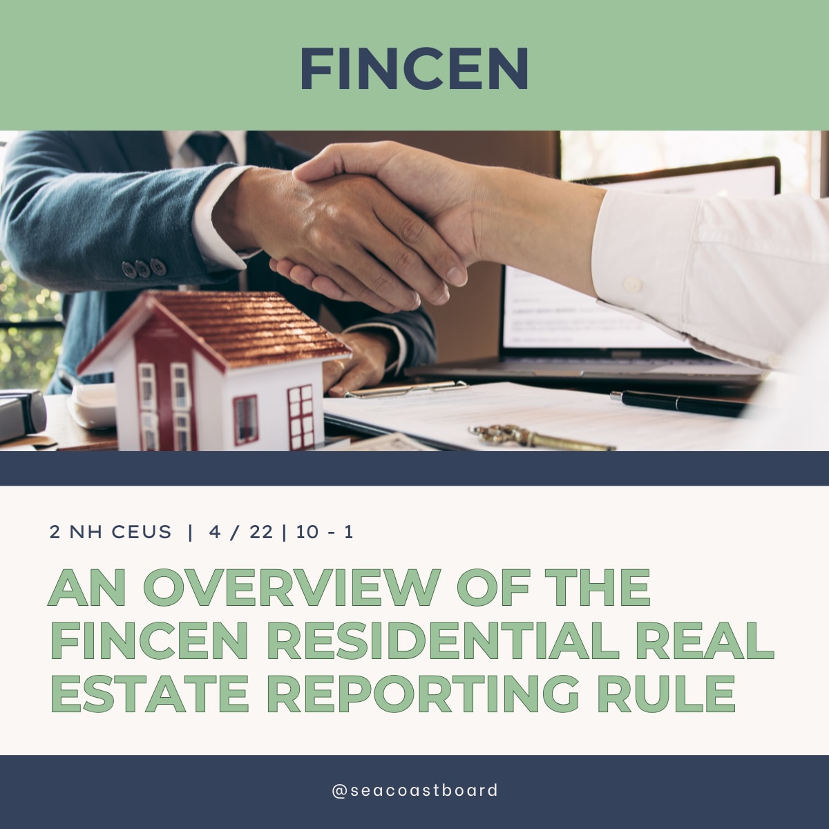 2 NH CEUs, with instructor Reema Maroun of First American Title Insurance Company. This course provides an overview of the FinCEN Residential Real Estate Reporting Rule, effective March 1, 2026. Participants will learn how to identify reportable residential real estate transactions, distinguish covered and exempt transfers, and understand their compliance responsibilities under federal reporting requirements.