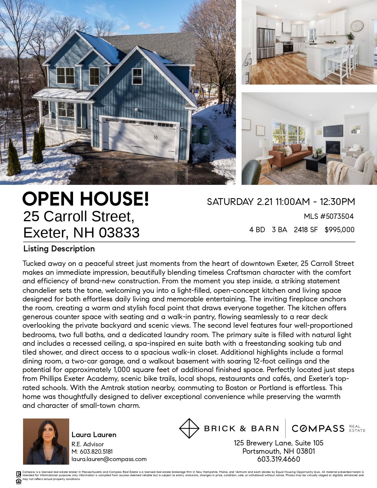 Tucked away on a peaceful street just moments from the heart of downtown Exeter, 25 Carroll Street makes an immediate impression, beautifully blending timeless Craftsman character with the comfort and efficiency of brand-new construction. From the moment you step inside, a striking statement chandelier sets the tone, welcoming you into a light-filled, open-concept kitchen and living space designed for both effortless daily living and memorable entertaining. The inviting fireplace anchors the room, creating a warm and stylish focal point that draws everyone together. The kitchen offers generous counter space with seating and a walk-in pantry, flowing seamlessly to a rear deck overlooking the private backyard and scenic views. The second level features four well-proportioned bedrooms, two full baths, and a dedicated laundry room. The primary suite is filled with natural light and includes a recessed ceiling, a spa-inspired en suite bath with a freestanding soaking tub and tiled shower, and direct access to a spacious walk-in closet. Additional highlights include a formal dining room, a two-car garage, and a walkout basement with soaring 12-foot ceilings and the potential for approximately 1,000 square feet of additional finished space. Perfectly located just steps from Phillips Exeter Academy, scenic bike trails, local shops, restaurants and cafés, and Exeter’s top-rated schools. With the Amtrak station nearby, commuting to Boston or Portland is effortless. This home was thoughtfully designed to deliver exceptional convenience while preserving the warmth and character of small-town charm.